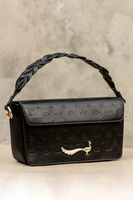 Lotus and peacock motif embossed design, Detachable braided shoulder strap, Monogrammed texture on leather