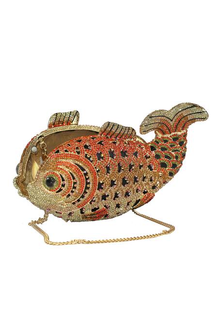 Gold, orange glittering goldfish shaped clutch is intricately studded with almost 4000 crystals in different sizes and colours. Comes with chain.