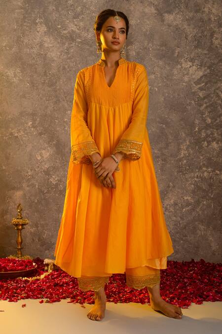 Yellow Silk Chanderi Embroidered Zari And Kaalidar Kurta Palazzo Set