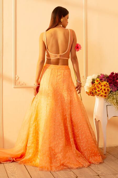 Peach organza lehenga with all over embroidery. Comes with embroidered blouse & dupatta.