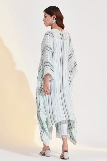 Ivory kaftan featuring hand embroidered blue striped pattern with lace, pearls, and cutdana detailing. Paired with coordinating palazzo and a shantoon slip.