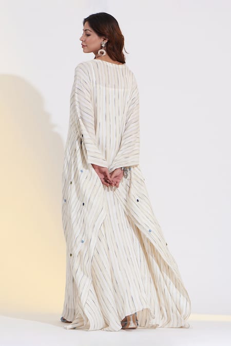 Ivory kaftan featuring hand embroidered motifs with a gold and blue striped pattern. Paired with a shantoon slip, it includes flared sleeves and a notched neckline.