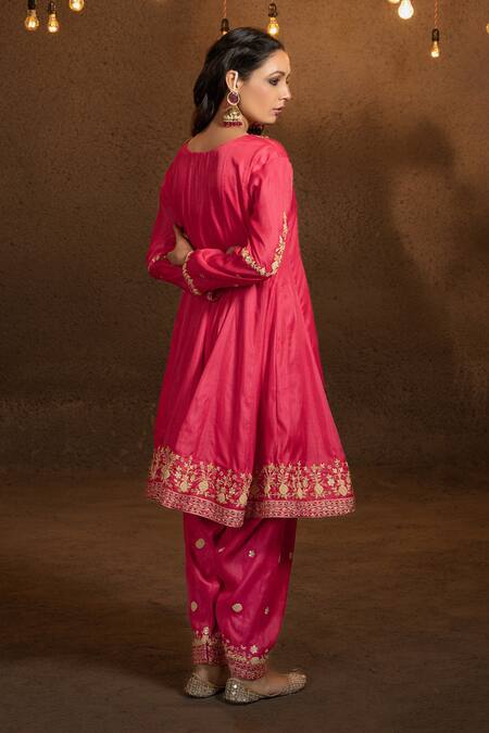 Hot pink A-line kurta with resham, pearl embroidery in mirror work. Paired with salwar & dupatta.