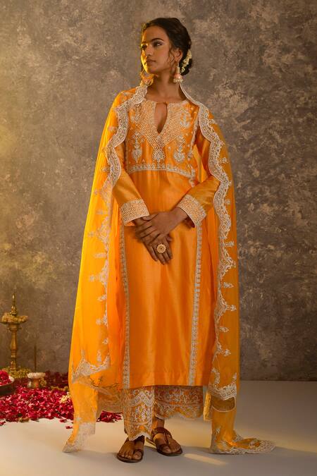 Marigold silk chanderi kurta with dori work embroidery. Comes with embroidered palazzo & silk organza dupatta.