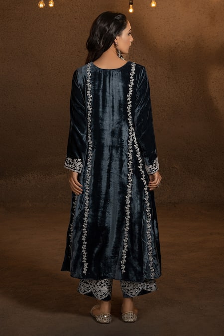 Blue Silk Velvet Embroidery Dori Notched Kurta Set