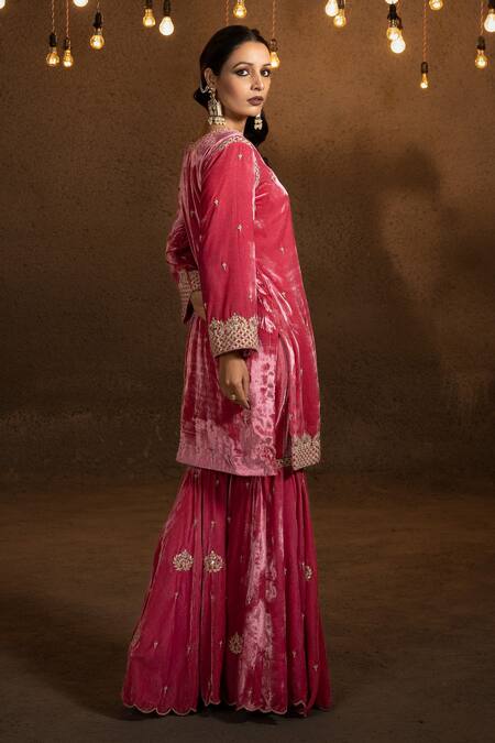 Pink Silk Velvet Embroidery Dabka Leaf Neck Kurta Gharara Set