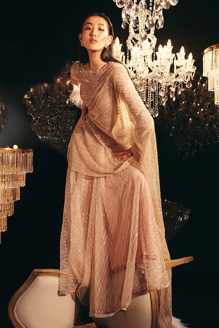 Beige pink net saree with sequin and bugle beads embroidery in a striped pattern and feather detail on the pallu. Comes with floral embroidered padded blouse.