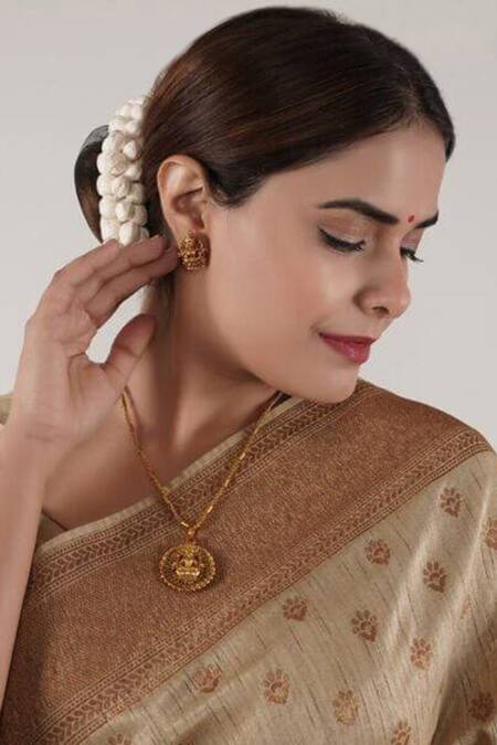 Buy_Smars Jewelry_Gold Plated Carved Goddess Lakshmi Pendant Necklace Set_at_Aza_Fashions