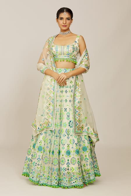 Ivory lehenga in georgette featuring resham and mirror work with side details. Paired with an embroidered tasseled padded blouse and an organza dupatta.