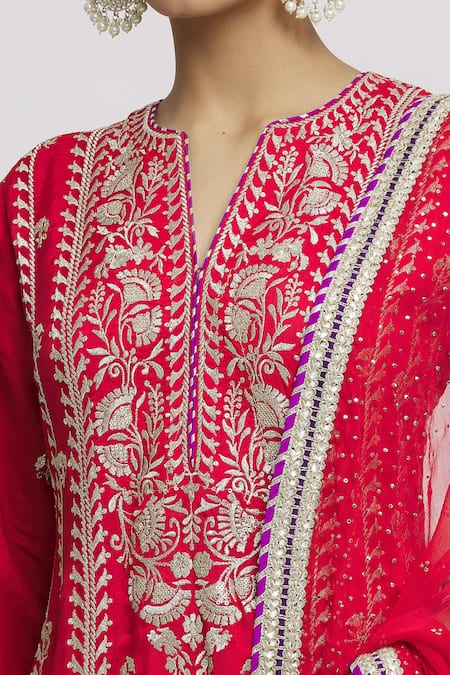 Red anarkali featuring intricate floret embroidery and a notched neckline. Paired with a churidar and chiffon badla dupatta.