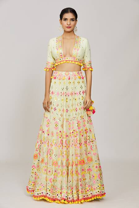 Green lehenga featuring floral and geometric patterns with mirror and sequin embroidery. Paired with a padded blouse and embroidered dupatta with fringe tassel details.