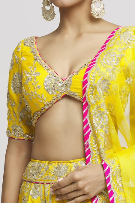 Yellow lehenga featuring zardozi embroidery, chandbali motifs, and sequin highlights. Paired with a padded blouse and an organza dupatta.
