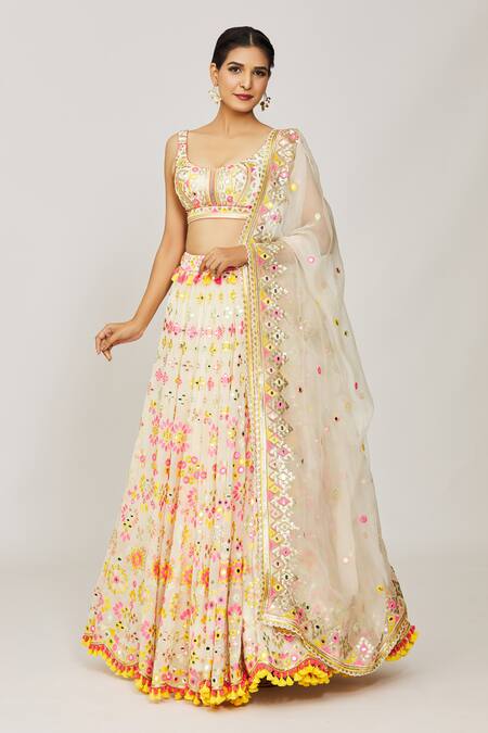 Multi color georgette flared lehenga adorned with floral and geometric patterns, featuring mirror and sequin embroidery. Accompanied by an embroidered padded blouse and an organza dupatta.
