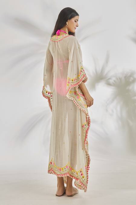 Ivory kaftan crafted in organic cotton featuring scallop trim border with mirror and thread embroidery
