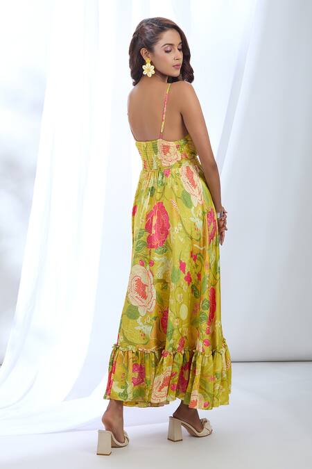 Yellow Satin Halter Neck Botanical Print Strappy Dress