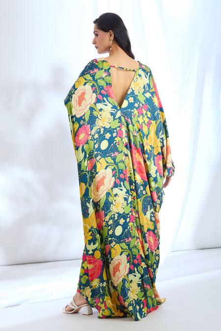 Blue Satin Lace, Mirrors V-neck Chrysanthemum Print Embellished Kaftan