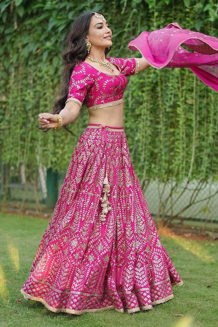 Rani lehenga with gota embroidery, embellished with mirrors and gota appliqu . Paired with a fitted embroidered blouse & organza dupatta, with gota highlights on the hem.