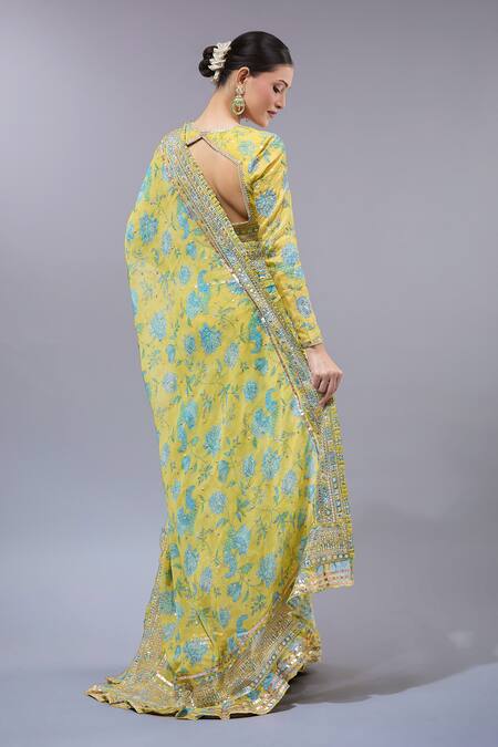 Yellow georgette saree featuring floral prints and embellished borders. Paired with a cotton silk blouse and a lycra petticoat.