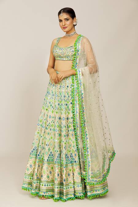 Ivory embroidered lehenga featuring intricate mirror and resham work, complemented by a padded bustier and an organza dupatta. The lehenga includes a back tasseled tie-up detail.