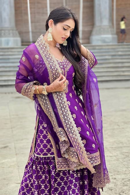 Purple Top Tussar Lehenga Brocade Dupatta Embroidered Kurta And Gharara Set