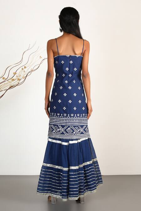 Navy strappy kurta with all-over embroidery and gota trim details. Paired with sharara and dupatta.