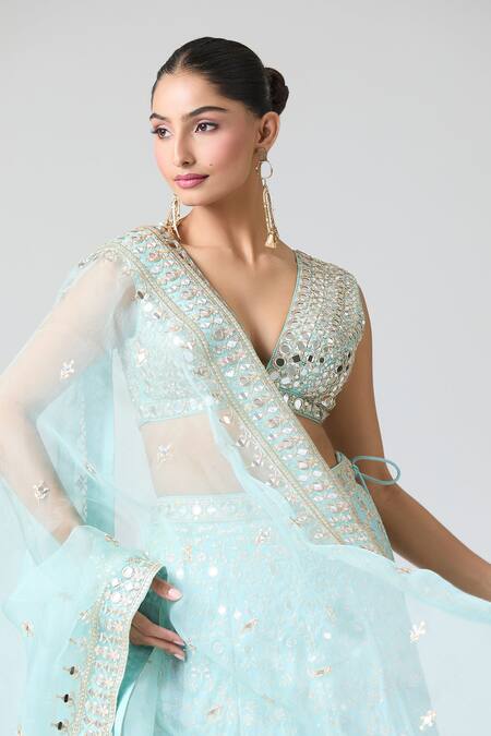 Powder blue lehenga featuring mirror and thread embroidery with floral jaal work. Paired with a padded embroidered blouse and an organza dupatta.