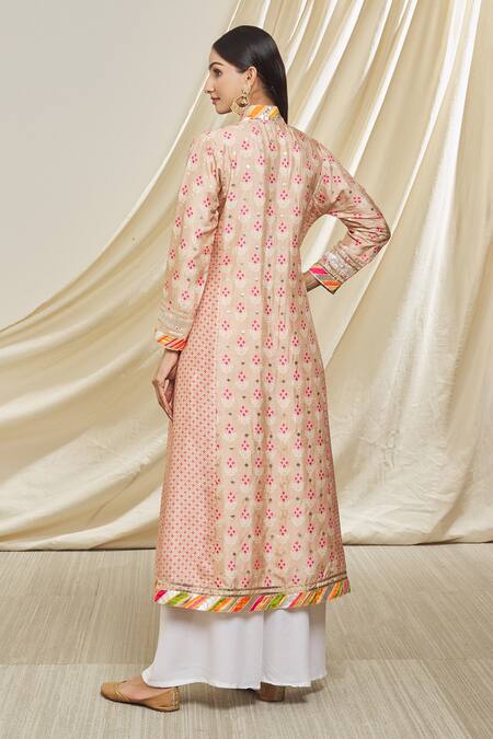 Blush pink floral pattern jacket style tunic featuring a V-neckline and full sleeves