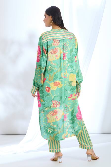 Green floral printed asymmetric tunic featuring a collared neckline and full sleeves. Paired with striped pants for a complete look.