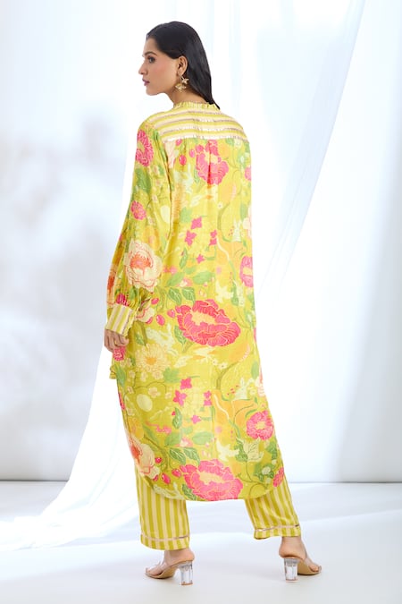 Yellow floral print tunic featuring a collared neck, full sleeves, and an asymmetric hem. Paired with striped pants for a coordinated look.