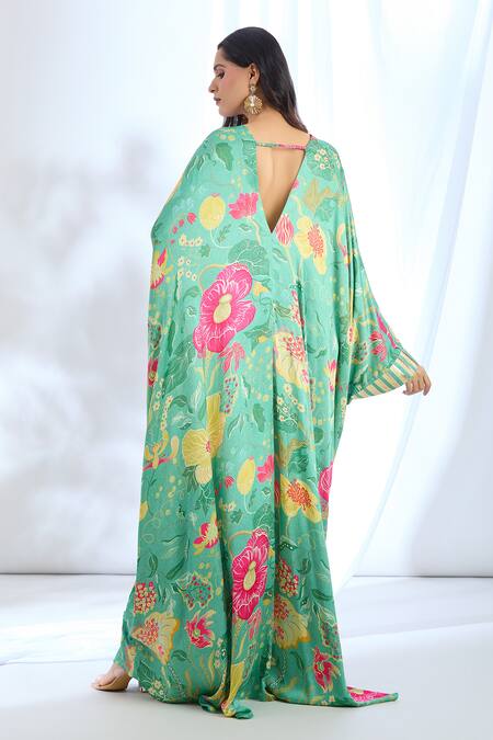 Mint kaftan featuring floral bouquet patterns with embellished lace on sleeves