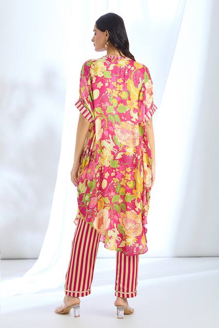 Gota detailing on neck and sleeve hem, Floral pattern all over, Stripe pattern on pant