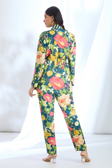 Navy overlapping blazer featuring floral print all over with stripe pattern on the collar and front pockets. Paired with a stripe print pant.