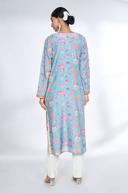 Blue Cotton, Silk Embroidery, Gota Patti Split Floral Print Straight Kurta