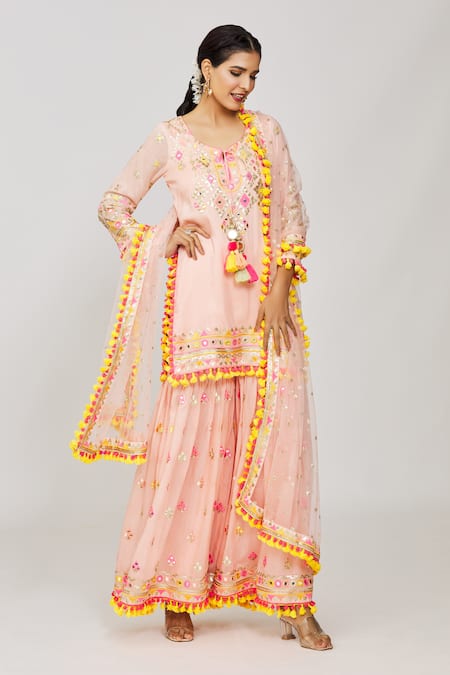 Pink kurta featuring geometric pattern with mirror and sequin embroidery. Paired with flared sharara and embroidered organza dupatta with fringe tassel border.
