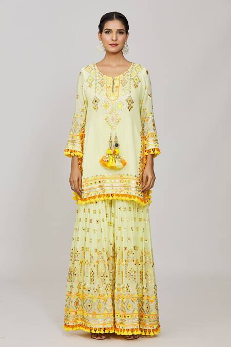 Yellow kurta featuring a round neckline with mirror and sequin embroidery, paired with a flared embroidered sharara and an organza dupatta. The set includes tasselled tie-ups and fringe drop details for added flair.