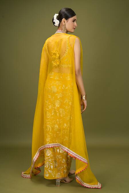 Yellow Chiffon Embroidery Alia Floral Pattern Draped Skirt Cape Set