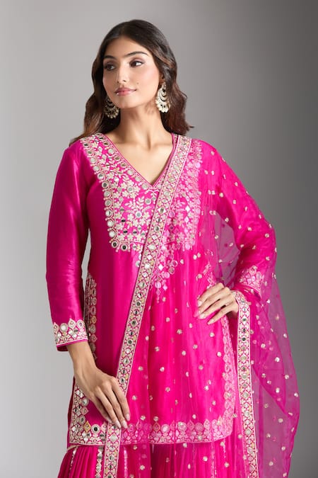 Rani pink kurta featuring V neck and three fourth sleeves with all-over mirror, thread, and gota patti embroidery. Paired with an embroidered sharara and a net dupatta.