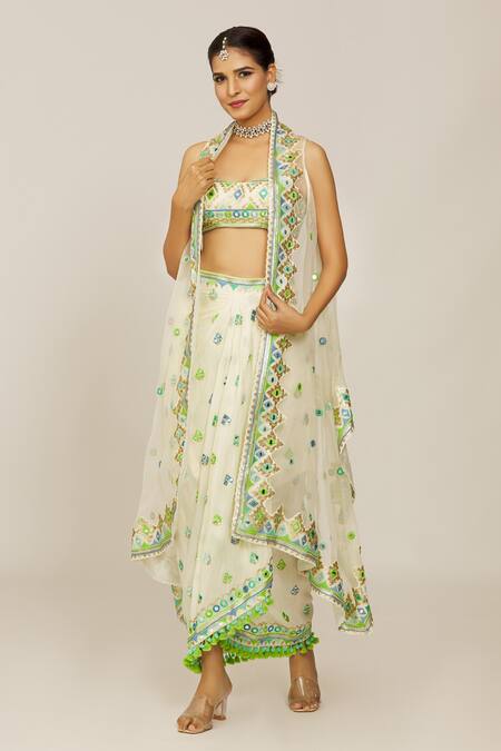 Ivory Georgette, Crepe Embroidery, Tassels Round Harita Cape Draped Skirt Set
