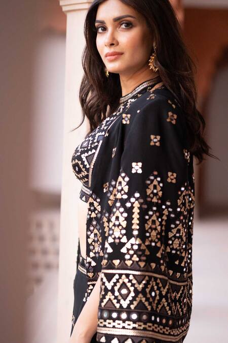 Black sharara set featuring a halter neck blouse with center cutout and an open front blazer. The ensemble is embellished with mirror, resham, and sequin work, complemented by long cut sleeves on the jacket.