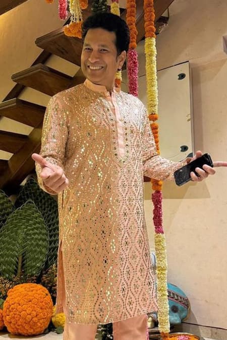 Pink kurta featuring full sleeves and mandarin collar with katri mirror jaal embroidery. Paired with matching tussar pants.