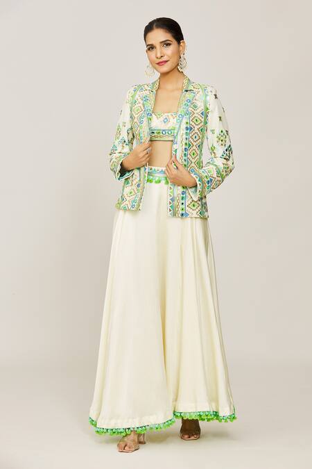 Ivory embroidered blazer crafted in georgette with mirror and sequin details. Paired with an embroidered bustier and viscose skirt featuring decorative trims.