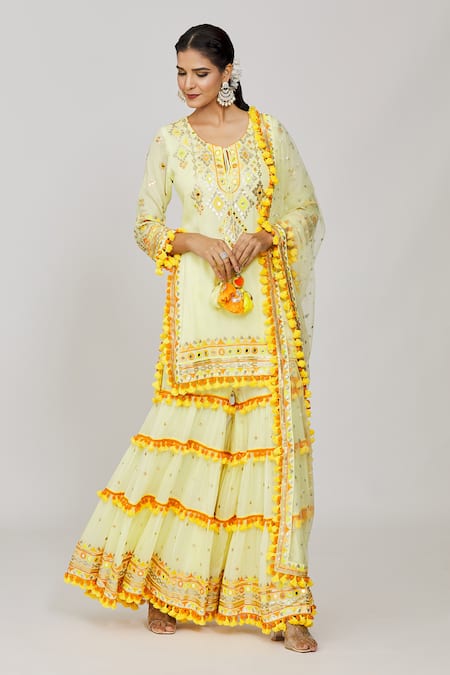 Yellow kurta featuring round neckline, three quarter sleeves, and geometric pattern with thread, mirror, and sequin work. Paired with a multi-layered tiered sharara and embroidered net dupatta with fringe drop tassel details.