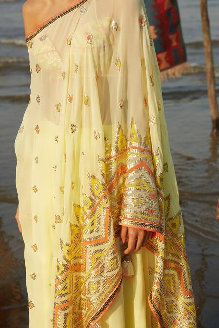 Yellow one shoulder tunic with ikat print and sequin embroidery. Comes with bustier and flared pants.