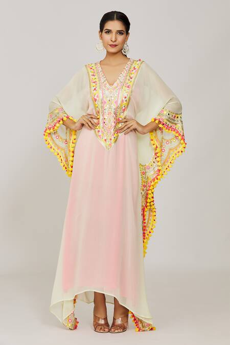 Mint green georgette kaftan featuring colorful pompoms, tassels, and intricate mirror and sequin embroidery. Paired with a matching georgette inner and designed with a plunging V neckline and asymmetric sleeves.