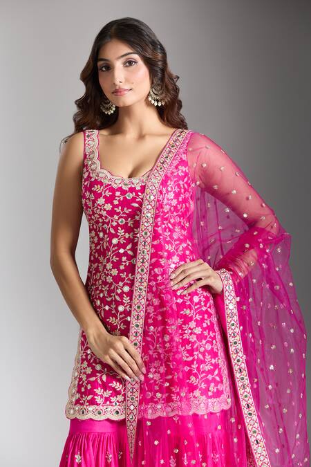 Rani pink sleeveless kurta featuring all-over gullista mirror and thread embroidery. Paired with an embroidered sharara and net dupatta.