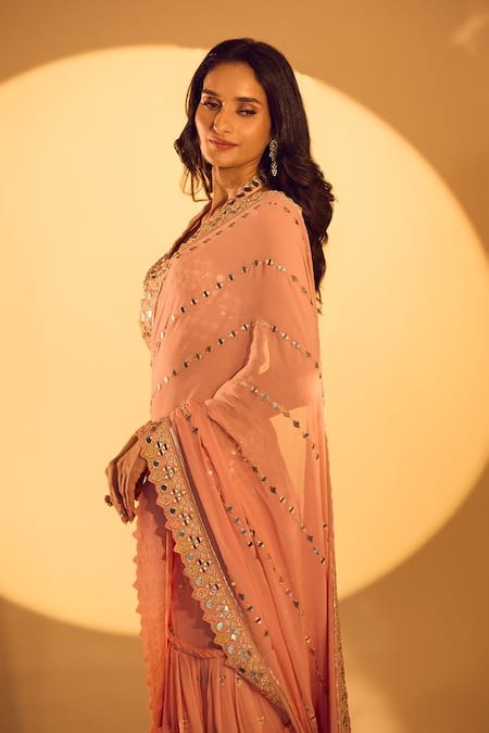 Pink Tussar, Georgette Mirrors, Zari Halter Neck Embroidered Saree And Blouse