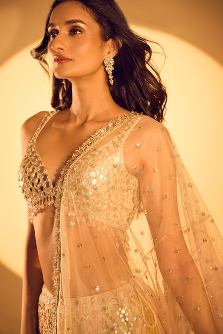 Crystal drops on blouse hem, Attached lining in lehenga, Intricate Mughal pattern embroidery