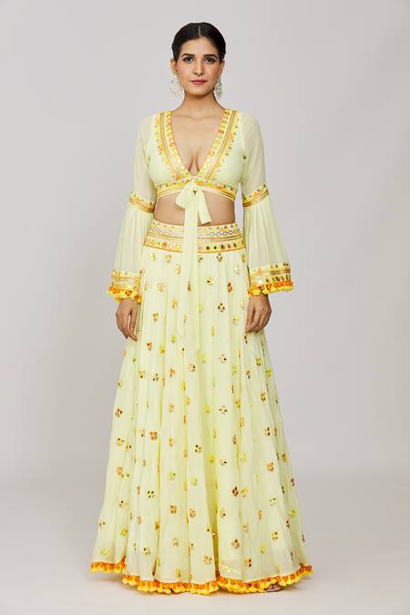Yellow lehenga featuring all-over geometric patterns with thread, mirror, and sequin work. Paired with a plunging V-neck blouse with flared sleeves and fringe tassel details.