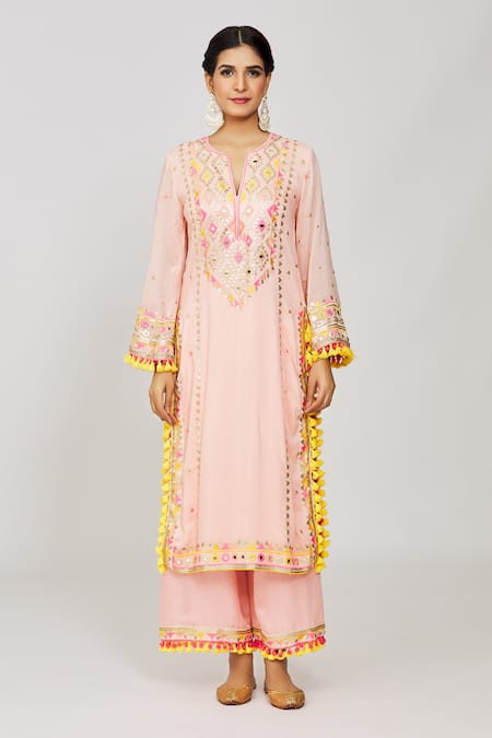 Buy_Gopi Vaid_Pink Viscose, Linen, Chiffon, Satin Pom-poms, Geometric Kurta Palazzo Set _Online_at_Aza_Fashions