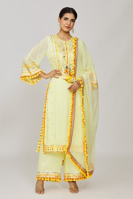 Yellow kurta featuring bell sleeves, round neckline, and intricate geometric embroidery. Paired with a palazzo and a dupatta adorned with fringe drop tassels.